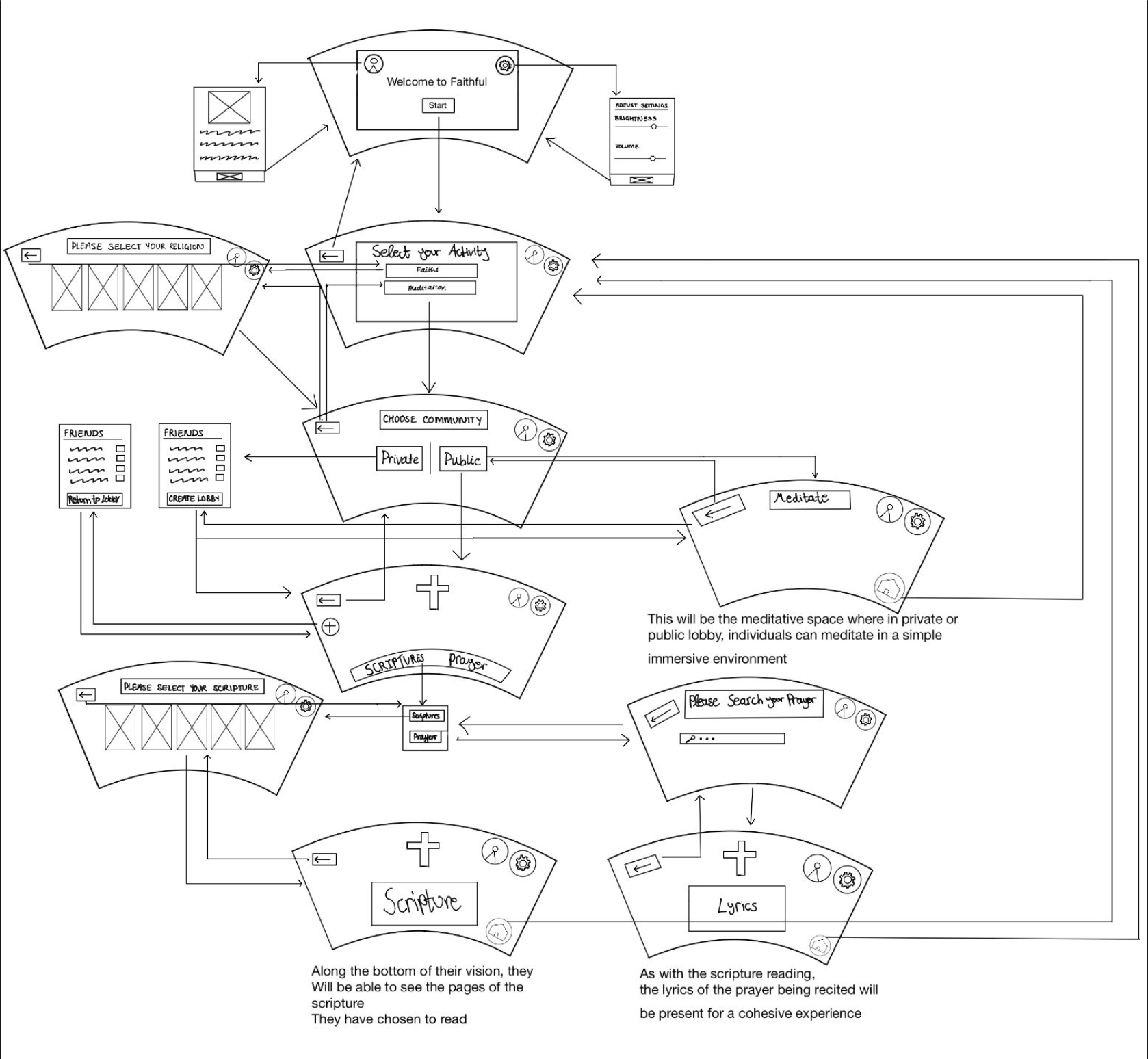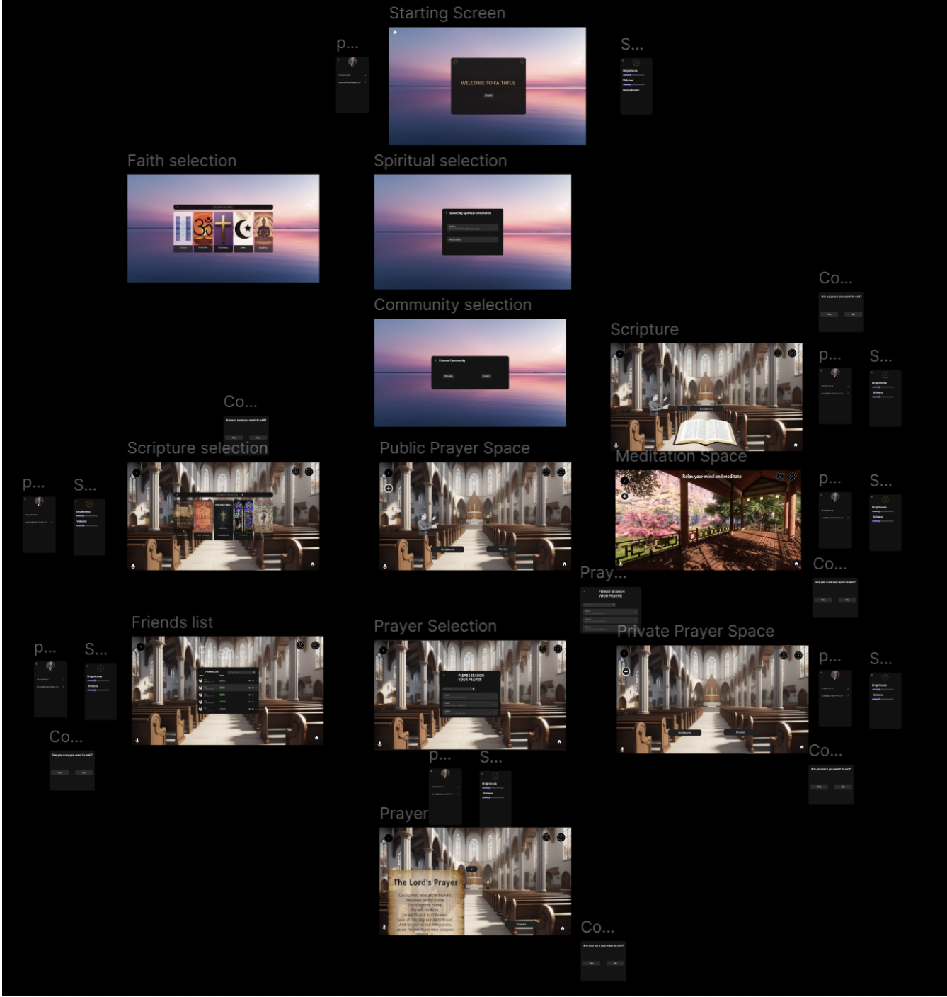 The images from the report capture the iterative design process used to address the challenge of social isolation among older adults, particularly those unable to attend cultural or religious gatherings in person. The storyboard outlined how an elderly user could enter a VR environment from home, engaging in prayer or discussion within familiar cultural settings. This was developed into low-fidelity wireframes, focusing on accessibility with large text, simple navigation, and consistent icons to reduce cognitive load. Insights from stakeholder feedback then informed the high-fidelity prototypes, which introduced calming virtual spaces, private and group interaction options, and intuitive controls such as “Profile” and “Settings.” Later iterations added features like a home icon for easier navigation and voice commands to support users with limited dexterity. Collectively, the images demonstrate how the design evolved from sketches to detailed prototypes to create a VR platform that is inclusive, accessible, and socially meaningful for older adults.