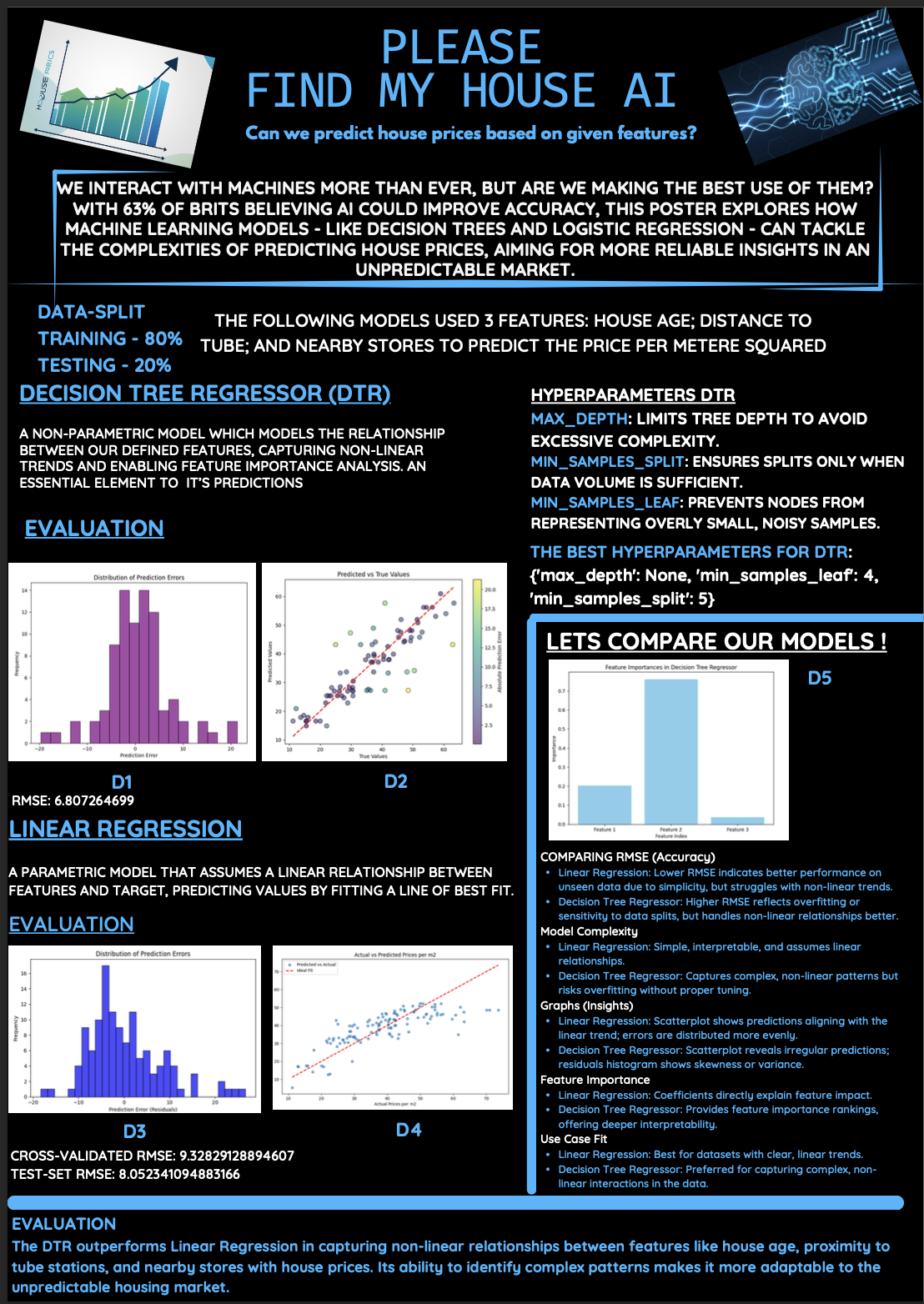 The Linear Regression model served as a simpler, more interpretable baseline, assuming a linear relationship between features and house prices. Its implementation included data preparation, coefficient estimation, and residual analysis to assess fit quality. While linear regression struggled with non-linear trends, it provided lower variance and offered transparency by directly showing the impact of each feature through its coefficients. Accuracy was again assessed using RMSE, allowing a clear comparison against the more flexible decision tree model. Together, the two implementations demonstrated the trade-off between interpretability and complexity in predictive modelling.