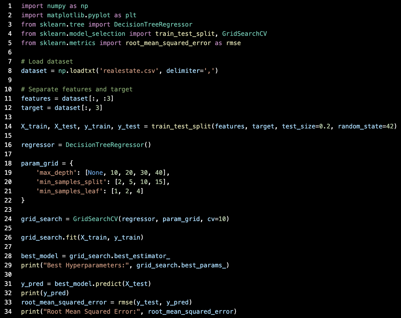 The Decision Tree Regressor (DTR) was implemented to capture non-linear patterns in predicting real estate prices. By recursively splitting the dataset based on feature thresholds, the model was able to uncover complex relationships between inputs such as house age, distance to transport links, and nearby amenities. The implementation included data preprocessing, train-test splits, and hyperparameter tuning of parameters like maximum depth, minimum samples per split, and minimum samples per leaf. This helped prevent overfitting while retaining the model’s ability to highlight feature importance. Performance was measured using Root Mean Squared Error (RMSE), which provided a benchmark for evaluating predictive accuracy on unseen data.